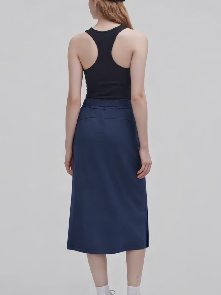 Craquez pour cette jupe longue bleu marine au tombé fluide et à la ligne épurée. Confortable, facile à porter et élégante, elle accompagne aussi bien les journées décontractées que les looks urbains soignés.