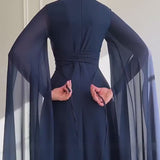 Envie d’un look à la fois majestueux et raffiné ? Cette robe longue bleu marine au style cape transforme chaque entrée en moment inoubliable.